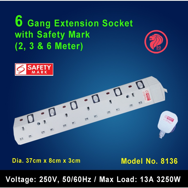 2/3/4/5/6 Gang Extension Socket with Singapore Safety Mark (2, 3 & 6 Meters)