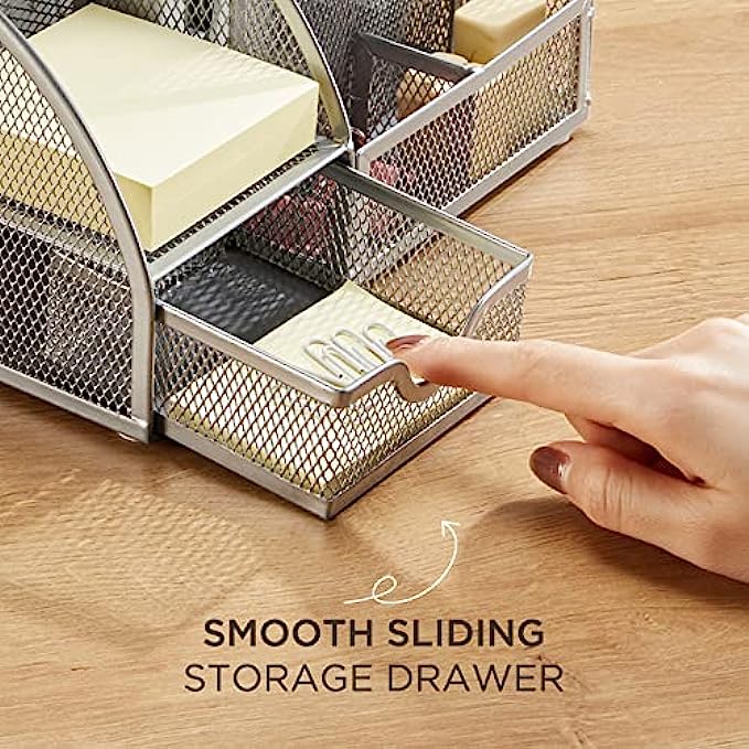FURNINXS Mesh Desk Organizer with 7 Compartments, Office Desktop Supplies with Drawer, Metal Stationary Organizer Desk Caddy Pencil Holder, Silver