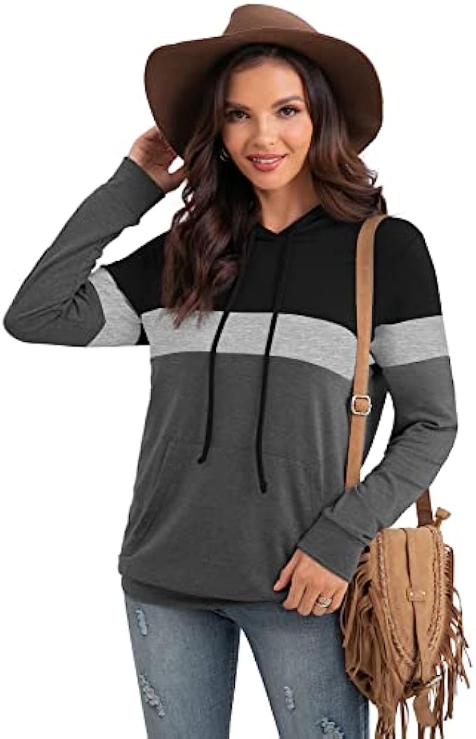 PrinStory Womens Hoodies Pullover Sweatshirts Tunic Top Color Block Long Sleeve Fall Drawstring Tops With Pocket