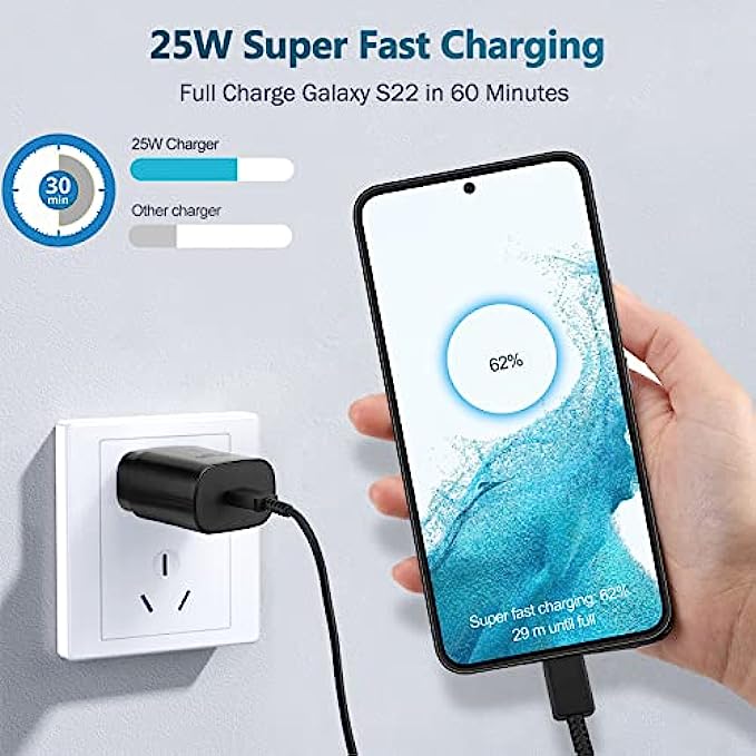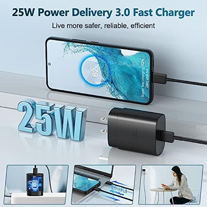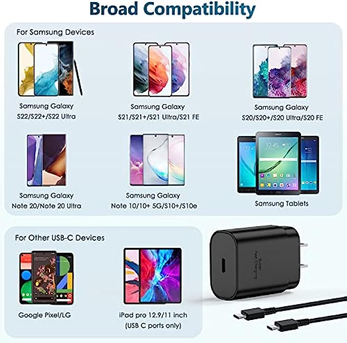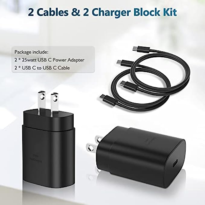 【Super Fast Charger】The 25W Type C charger cable kit supports multiple fast charging techonology, Samsung super fast charging, PD 3.0, PPS, and QC 4.0. It provide fast charging up to 25W output, super fast charging for Samsung Galaxy S21, S21 Ultra, S21 Plus, S22, S22+, S22 Ultra, Note 10, Note 20, S20 from 0% to 50% in just 30 min,full charge Galaxy S21 in 1h, full charge Galaxy S22 in 50 min. 【Compatible Devices】The USB C wall charger cable kit supports most of most of USB C devices, including Samsung Galaxy S21/ S21+/ S21 Ultra 5G/ S22/S22+/S22 Ultra/Note10/ 10+, Note 20/20 Ultra 5G, S20/S20+/S20 Ultra 5G/ S20 FE(Fan Edition) 5G, S10, S10+, Galaxy Z fold 3/ Galaxy Z Flip 3,S10e, S9, S9+ Plus, S8, S8+ Plus/Active, Pixel, Pixel 2, Pixel 3, Pixel XL, Pixel 2XL, Pixel 3XL, Pixel 3A, LG G7 Thing, G6, G5, V20, V30, V35, V30S, V40 ThinQ Plus. 【5FT USB C to USB C Cable】Package included a 5ft USB Type C charging cable, designed for fast charging and data transfer, meet different demand in your daily life. Not only can fast charge your cell phones, but also can charge for tablets, include Samsung tablets and others which is USB C connector. 【Dependable Safety】Multiple built-in safeguards with this usb type c android phone charger kit to protect your devices against damage caused by short circuit, over-current, over-voltage, over-heating, and over-charging issues. Automatically stops charging when battery capacity is full to ensure your device safety and longevity. 【Package Contents】 2 × 25W PD USB C Charging Block, 2 × 5 feet Fast Charging C Charger Cable. If there is any questions, contact us at any time, we serve for you 24 hours.
