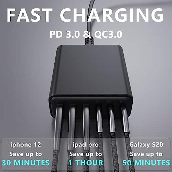 • 【SIX-in-One】: With 3USB-C Power 60Watt Delivery port, each port 20W and 3 USB port, you’re ready to charge six of your devices simultaneously. Extended power cord for convenience and portability Handy for home office and on-the-go charging.