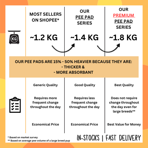 Performance:very good Quality:very good Suitability:great This brand is the best out of all I tried so far, others are thin and absorption is not good. This pee pad is thick and absorbs well hence I’m able to use for couple more times before I discard. So far is the most suitable for me, and I will continue to buy