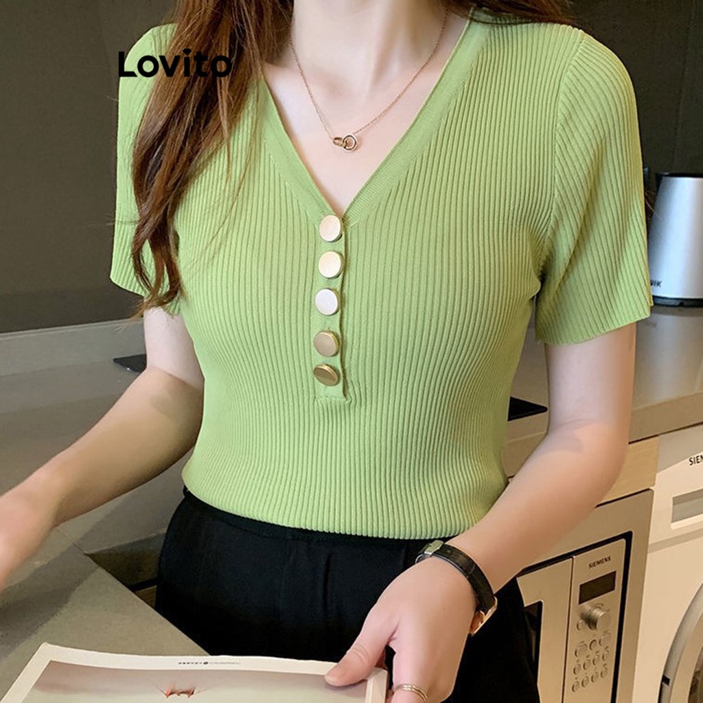 Lovito Casual Plain Button T-Shirt for Women LNL36064 (Apricot/Hot Pink/Green/Black)