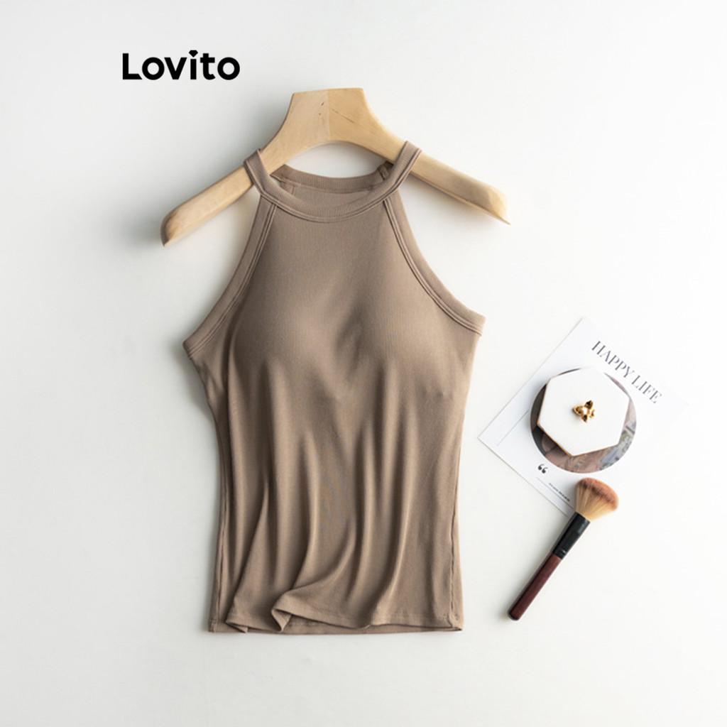 Lovito Casual Plain Chest Pad Tank Top for Women LNL36137 (Khaki/Apricot/Grey/White/Black)