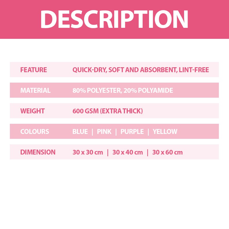 Quality:Feels decent Suitability:Good for wiping and absorbing Performance:Good? Nice cloths, relatively thick, is it the thickest? No idea. Soft and plush feeling, relatively absorbent. For its price? Really worth it. Delivery and processing is really fast though!