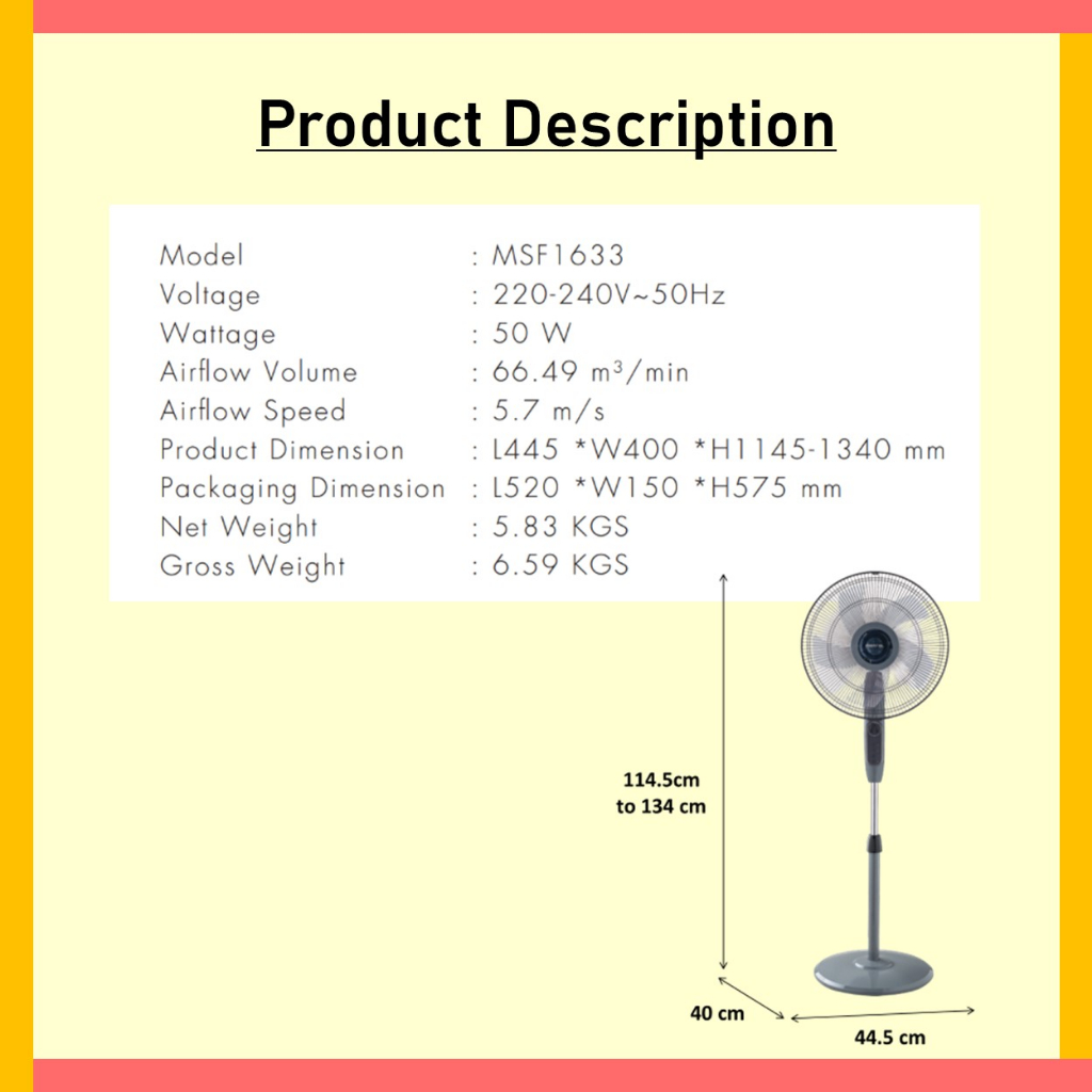 Performance:not bad Value For Money:value for money Best Feature(s):strong wind, stable stand Bought it as my wall fan spoilt, quite easy to assemble. The stand is quite heavy so do not have to worry about tumbling down. Maximum height stand seems ok for me, a bit lower than 158cm. There is sound coming out from 1,2,3 but I consider it white noise. Very strong wind even at 1, recommend to buy!