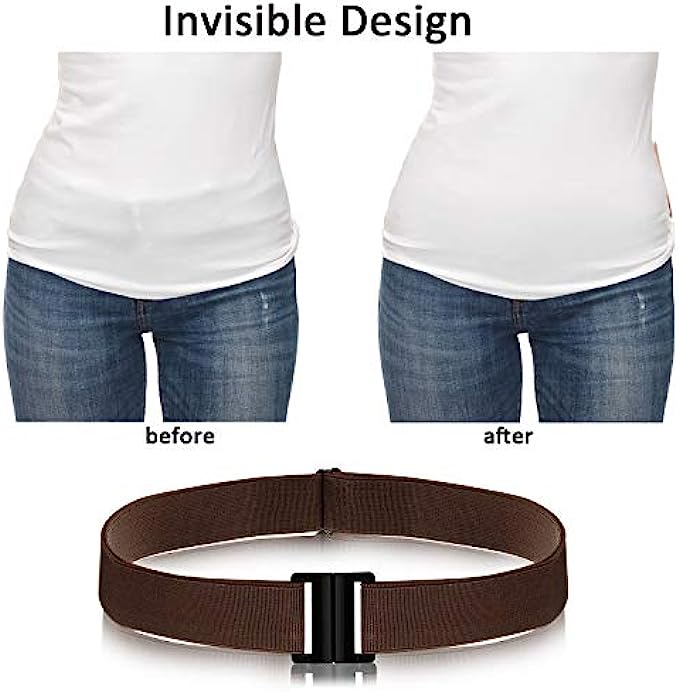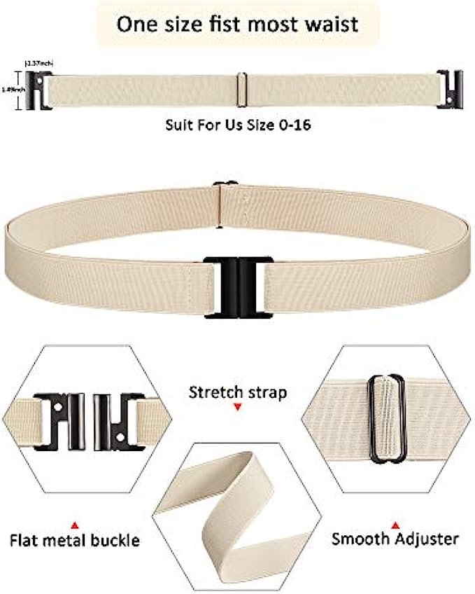 Elastic Snap closure Wet Wipe Clean What you get: you will receive the super easy latching and snapping adjustable stretch belts, the elastic material make the belts lightweight and breathable to wear, snap the plastic clasp to secure and press it to unbuckle, feel like wearing nothing and invisible Flat buckle: the plastic buckle is no show under your outfit or on your waist, does not like the bulky buckle, it provides a slimming appearance for you when keeping clasp tightly, no use of metal is also time-saving for security check Adjustable size: the invisible belt is approx. 100 x 3.5 cm/ 39.37 x 1.38 inches, fit for US size 0-16, , the buckle is 1.37 inch wide, 1.49 inch long; The elastic strap is flexible to adjust, one size fits most, holding up your pants and fit around your waist tightly Invisible design: if you have to wear a web belt but do not want the bulge part of a metal buckle, try this no show belt, flat buckle, no bulge, look smooth under clothes, provides an instant slimming effect, easy to pass metal detector Diverse occasions: the invisible waist belt is suitable for daily wear, travel, outdoor, work, school, to match jeans, dress, T-shirts, also good for those who are pregnant or losing weight, much more comfortable to wear than those hole belts