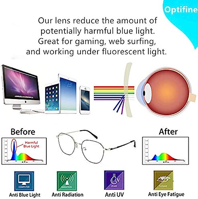 ? VERSATILE USE -- Designed for all-day wear. Optifine blue light blocking glasses are perfect for individuals who need to look at smartphone or computer monitors all day like office workers, tech engineers, and hardcore gamers